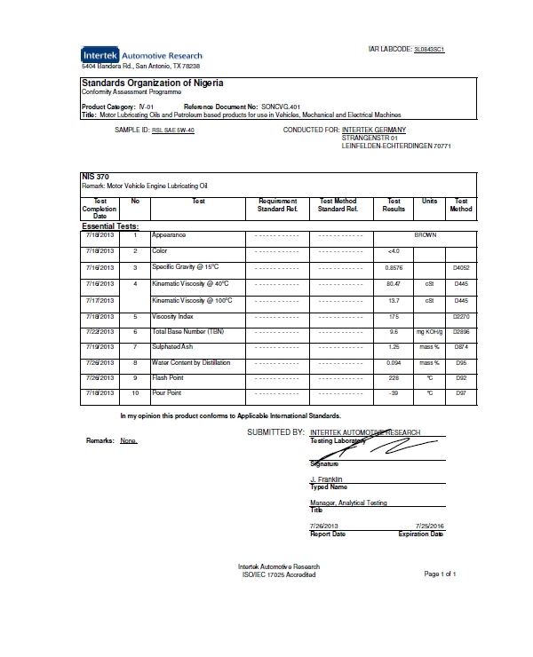 Результаты испытания масла 5W-40 международной лабораторией ISO/IEC 17025 Accredited
